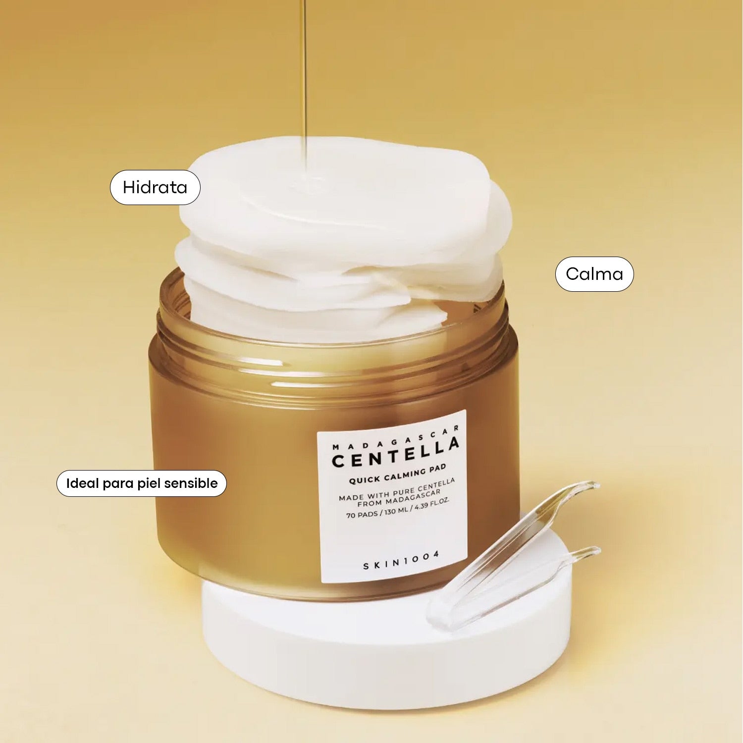 Pads calmantes impregnados con una esencia ligera rica en Centella Asiatica de Madagascar, diseñados para reducir rojeces, calmar irritación, hidratar y refrescar la piel de inmediato.